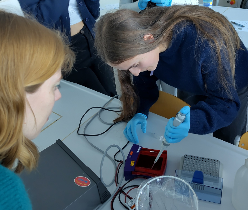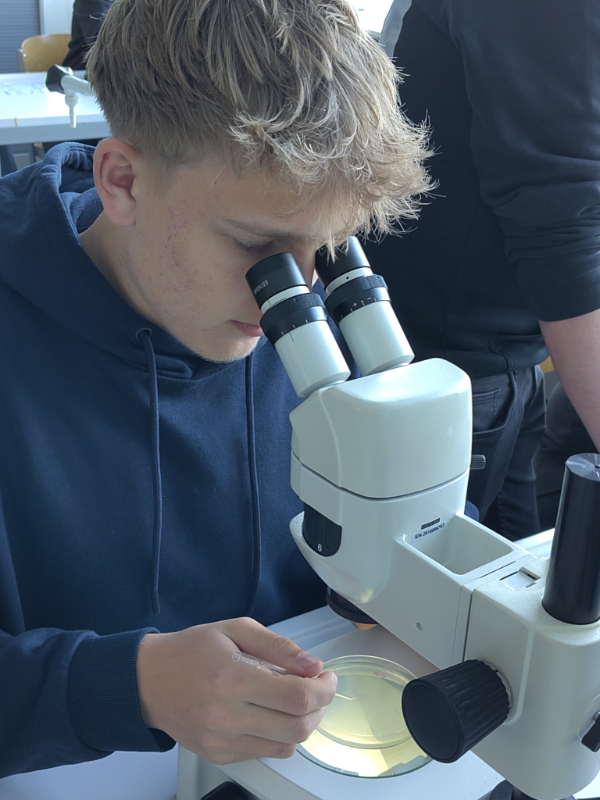 Das Flying Aging Lab bot den Schüler*innen die Möglichkeit, naturwissenschaftliche Arbeitsmethoden, wie sie an einer Universität gängig sind, kennenzulernen. Unter fachkundiger Anleitung führten sie Beispielsweise eine Gelelektrophorese durch, um mitgebrachte DNA-Proben zu analysieren. Die Schüler*innen lernten auch, wie Fadenwürmer als Modellorganismen genutzt werden können, um mehr über biologische Prozesse und das Altern zu erfahren. Mit Hilfe von Fluoreszenzmikroskopen konnten sie die winzigen Tiere aus nächster Nähe und in höchster Auflösung betrachten.