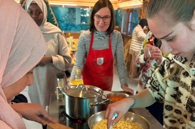 BORG-Schülerinnen und aus Kriegsgebieten geflüchtete Frauen kochen gemeinsam.