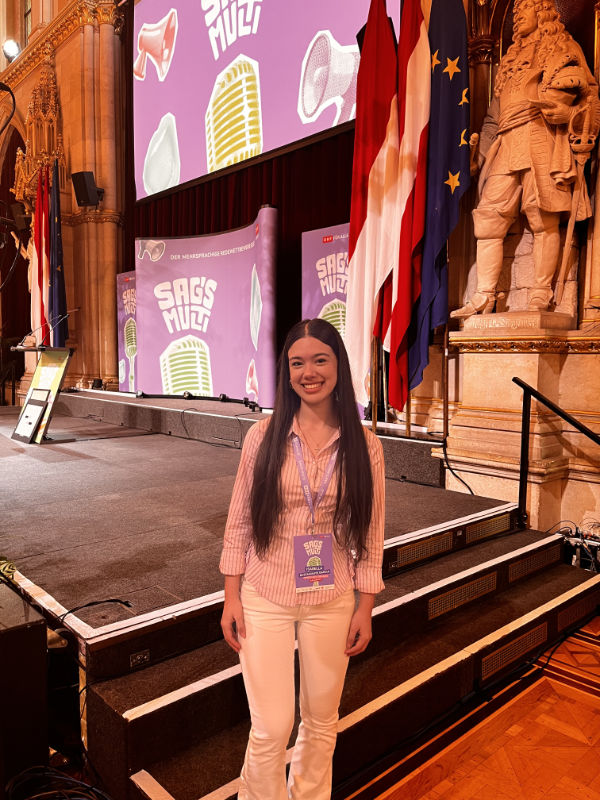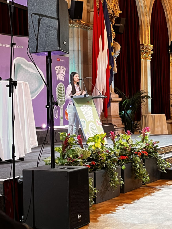 „Mein Wir endet nicht bei einem Reisepass, einer Flagge oder einem perfekten Akzent. Es schließt jene ein, die Namen haben, welche schwer auszusprechen sind, die zwischen Welten stehen – und auch jene, die nur einen einzigen Ort kennen, aber bereit sind, zuzuhören, bevor sie urteilen“, meint Isabella in ihrer Rede. Sie zeigt damit, wie wichtig es ist, aufeinander einzugehen und einander zuzuhören. Auch die Jury konnte sie berühren und belegte mit ihrer Rede den 2. Platz.