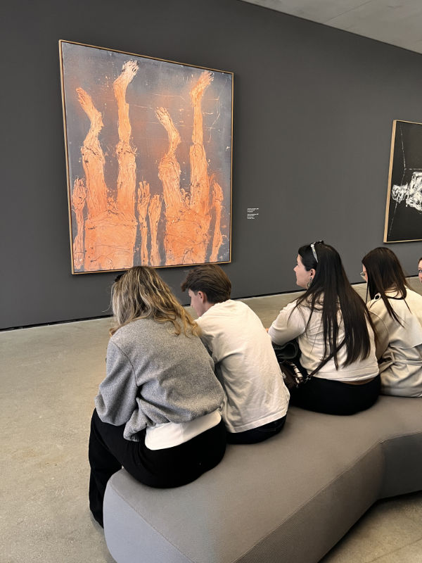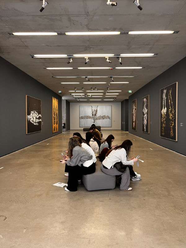 Im Mittelpunkt des Besuchs stand die Auseinandersetzung mit der Ausstellung des Künstlers Georg Baselitz. Besonders intensiv beschäftigten sich die Schüler*innen mit dem Gemälde „Ankunft demnächst“. Das Werk regte dazu an, zentrale Fragen zu erkunden: Was bedeutet Ankunft? Ist sie ein endgültiger Zustand oder vielmehr ein vorübergehender Moment? Und inwiefern bleibt jede Ankunft fragmentarisch, ein Zwischenzustand, der nie ganz abgeschlossen ist?